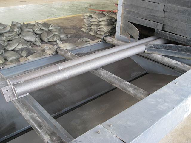 后工件表面表面的光潔度和粗糙度符合有關的標準規(guī)定。小口徑的鋼管使用內壁噴丸機,鋼管內壁噴丸處理線,主要包括移動臺車,砂斗,噴砂罐,噴槍,噴槍承載車,鋼管承載系統(tǒng),底部彈丸